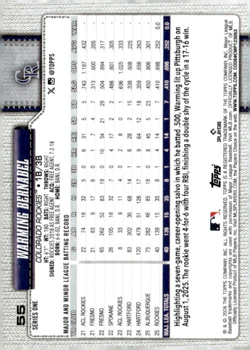 Warming Bernabel • Colorado Rockies • 2026 • Topps • Card #55