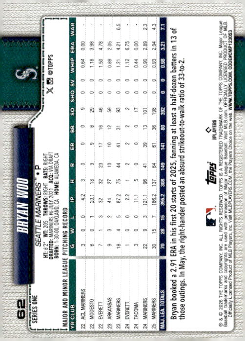 Bryan Woo • Seattle Mariners • 2026 • Topps • Card #62