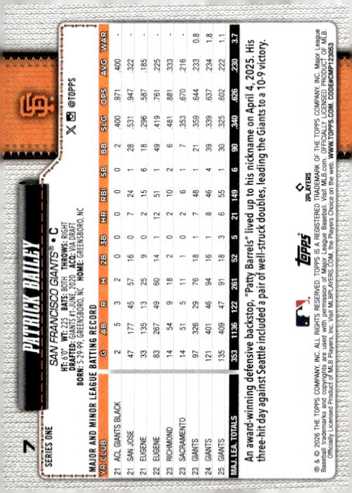 Patrick Bailey • San Francisco Giants • 2026 • Topps • Card #7