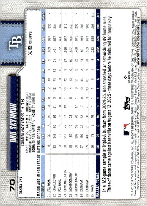 Bob Seymour • Tampa Bay Rays • 2026 • Topps • Card #70