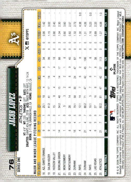 Jacob Lopez • Athletics • 2026 • Topps • Card #76