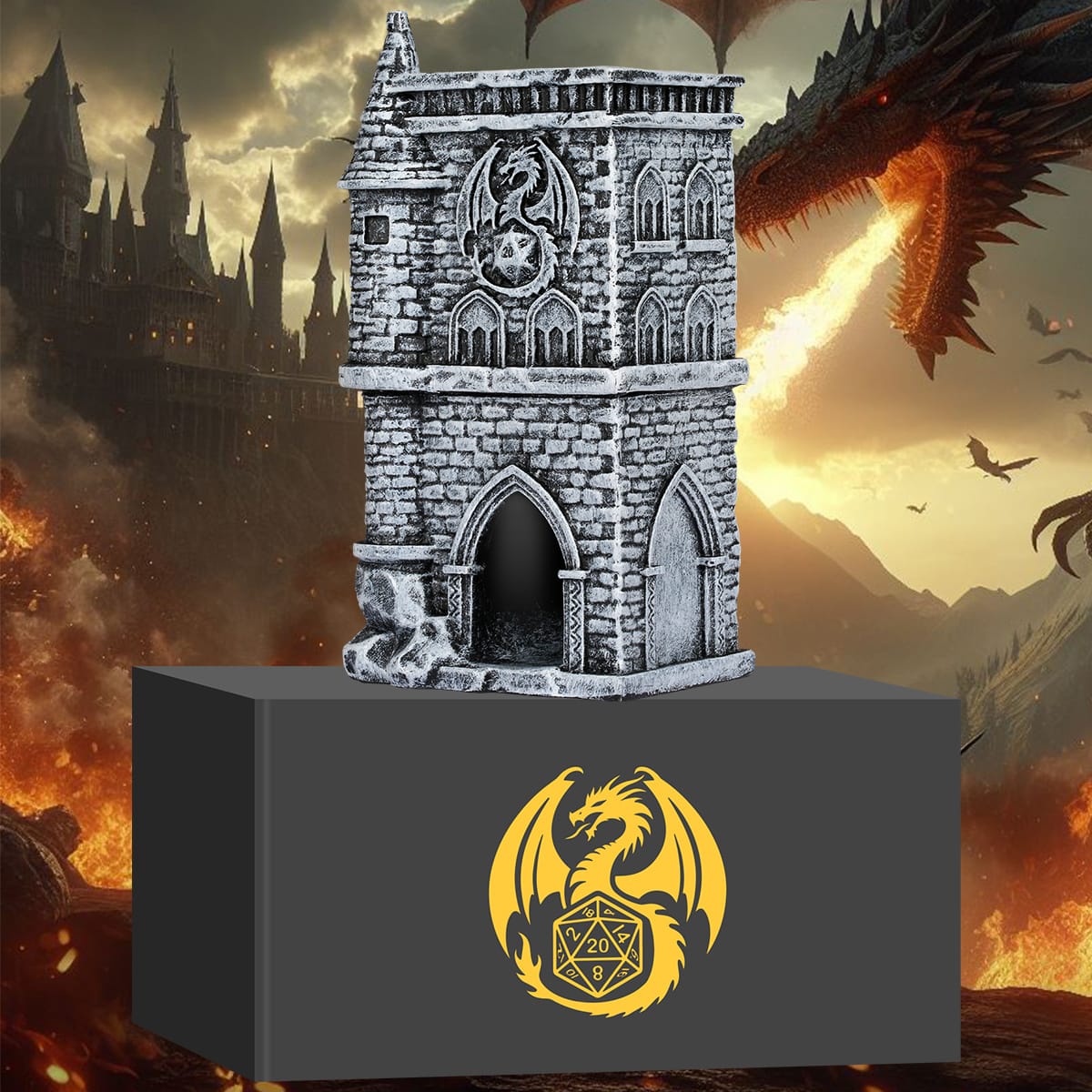 D20 Castle Resin Dice Tower Gift Box Set , Exquisite Medieval , Inspired Design, Ideal For Tabletop RPG Enthusiasts. Perfect For Adding A Touch Of Fantasy To D&D And Other Role – Playing Games.